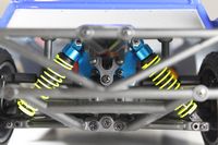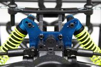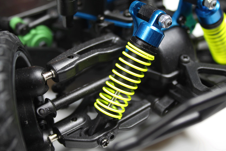Model jest wyposażony w wieżyczki amortyzatorów wykonane z niebieskiego aluminium anodyzowanego, do których są przymocowane plastikowe amortyzatory olejowe. Pokrywy amortyzatorów są wykonane z aluminium. Prześwit zawieszenia można regulować przy użyciu plastikowych zaczepów dystansowych. W poniższej sekcji poświęconej regulacji pokazano, jak położenie amortyzatorów wpływa na zachowanie modelu.