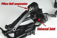 Zmiana położenia przednich amortyzatorów wpływa na zachowanie modelu. Użycie zewnętrznego górnego otworu zapewnia większą zwrotność i krótszy czas reakcji zawieszenia. Użycie wewnętrznego górnego otworu zapewnia bardziej płynne wybieranie nierówności kosztem mniejszej zwrotności. Użycie zewnętrznego dolnego otworu zapewnia większą sterowność przy wysokich prędkościach, natomiast użycie wewnętrznego dolnego otworu zapewnia większą sterowność przy niskich prędkościach. |