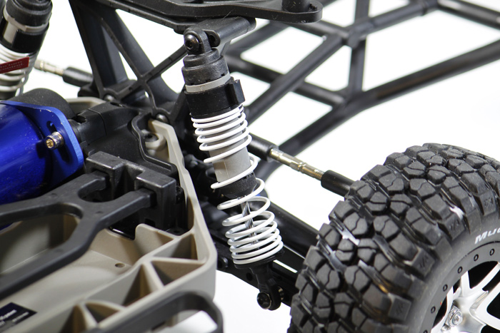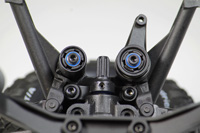 Wieżyczki amortyzatorów i wahacze dolne są wyposażone w wiele punktów mocowania amortyzatorów. Zmiana położenia amortyzatorów ma wpływ na kąt wychylania się modelu w zakręcie oraz prześwit.
