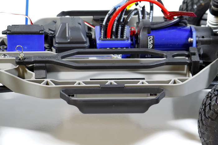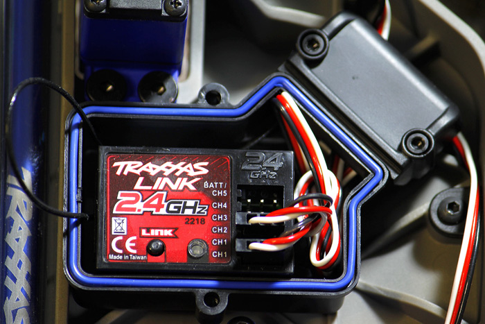 Pięciokanałowy odbiornik 2,4 GHz z systemem Traxxas Link umieszczono w wodoszczelnym pojemniku. Dwa gniazda kanału 1 umożliwiają podłączenie dwóch serw skrętu. W modelu Slash 4x4 takie rozwiązanie nie jest potrzebne, ale dobrze jest wiedzieć, że istnieje taka możliwość.