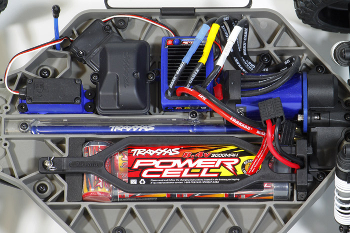 Aparatura w zestawie: 2-kanałowy programowalny nadajnik Traxxas TQ 2,4 GHz z systemem Traxxas Link, 5-kanałowy odbiornik oraz wodoszczelne cyfrowe serwo skrętu