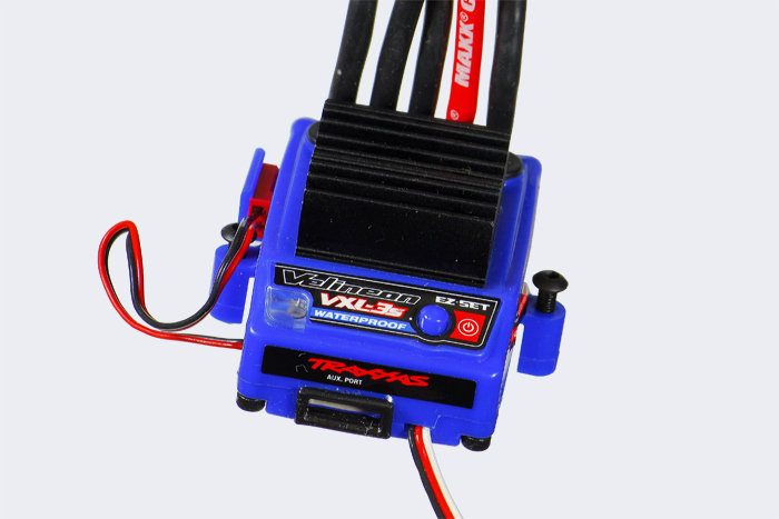 Bezczujnikowy (bezsensorowy) silnik bezszczotkowy Velineon 3500 jest połączony z regulatorem elektronicznym VXL-3S. Tak jak pozostałe podzespoły elektroniczne w modelu Slash 4x4, regulator jest wodoszczelny.