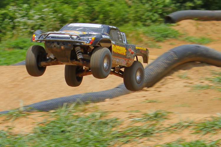 Skakanie nie było trudnym zadaniem, ponieważ model utrzymywał w powietrzu poziomą pozycję z delikatną tendencją do opadania jego przedniej części. Jeśli wzniesienie nie zostanie pokonane zbyt szybko, takie zachowanie sprawdza się znakomicie. Za największym wzniesieniem na tym torze nie ma spadzistej powierzchni lądowania, przez co zawieszenie kilkakrotnie dobiło model do ziemi. Aby szybko wyeliminować ten problem, zamontowałem kilka podkładek na amortyzatorach w celu zwiększenia prześwitu. Problem dobijania do ziemi został rozwiązany, ale model prowadził się lepiej bez podkładek, więc je wyjąłem.