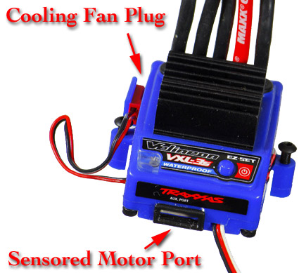 Jak pokazano na powyższej ilustracji, regulator VXL-3S jest wyposażony w gniazdo czujników silników bezszczotkowych oraz gniazdo wentylatora zewnętrznego.