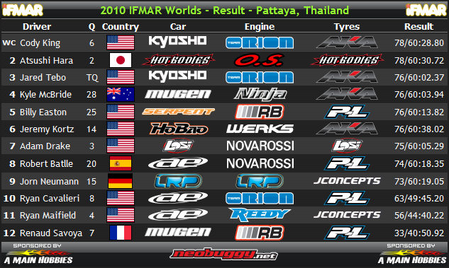 Jared Tebo, który tak wspaniale radził sobie w eliminacjach, wylądował w końcu na 3 pozycji (zgasł, ale mimo to dojechał 3) , za broniącym tytułu Mistrza Świata Atsushi Harą, który z kolei po bardzo wyrównanej walce, pełnej dramaturgii aż do ostatnich chwil, przyjechał do mety 2s za jadącym dla Kyosho Cody Kingiem. Nie obyło się też bez pechowych a nawet dziwnych incydentów jak gasnący silnik Rayana Maifielda, który do czasu zgaśnięcia prowadził, czy opiłki metalu, które pojawiły się niewiadomo skąd w zbiorniku Renaud-a Savoy-a.